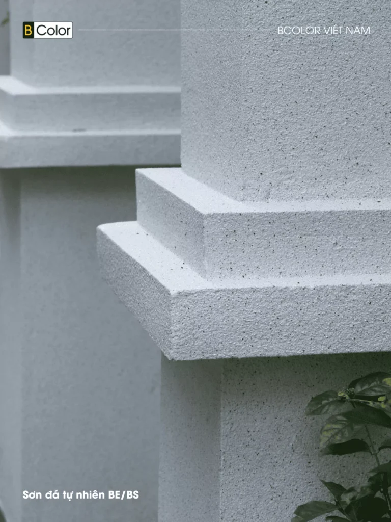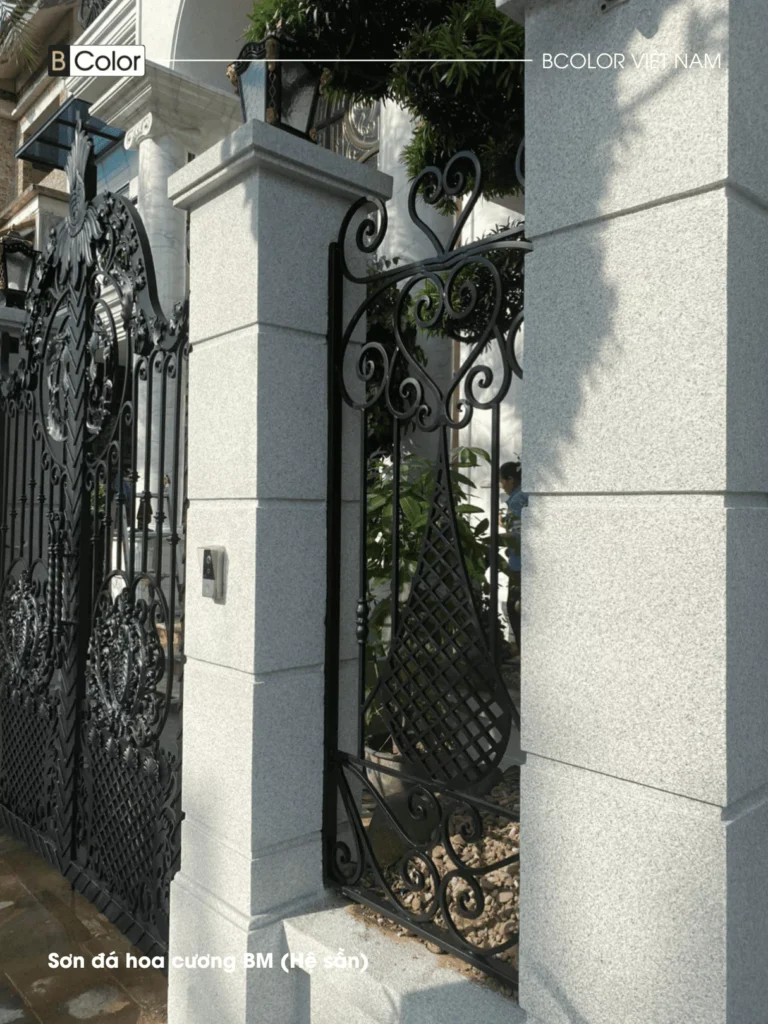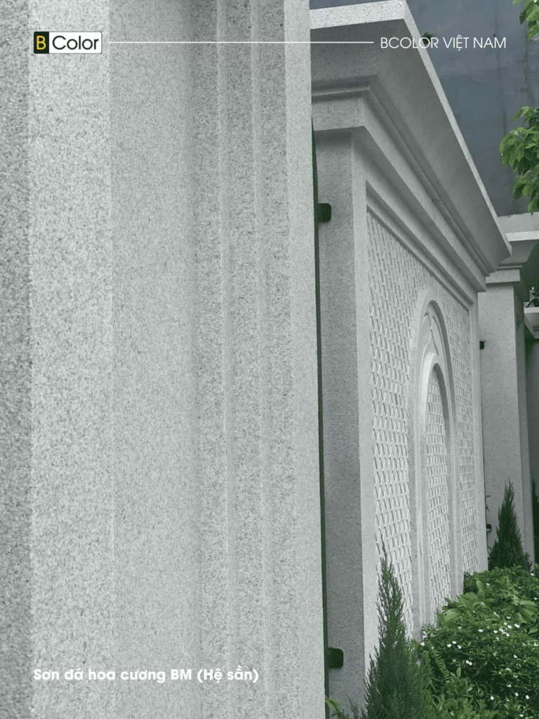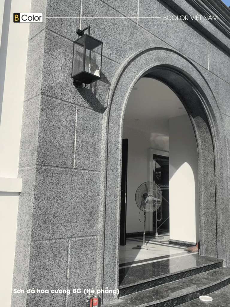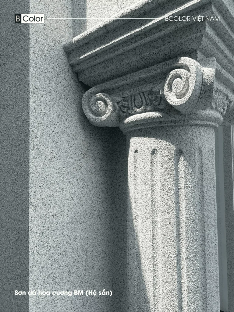 Sơn đá hạt dẹt: Phù hợp trang trí điểm nhấn cột,cổng, toàn cảnh ngoại thất, kiến trúc tân cổ điển, mang tới vẻ đẹp chắc chắn